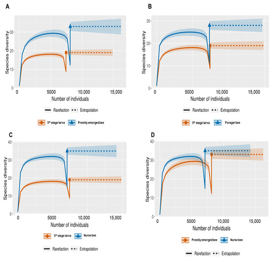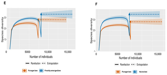 Species-size-based rarefaction (solid line) and extrapolation (dotted line) sampling curves with 95% confidence intervals (shaded areas) for different developmental stages. The developmental stages were compared with one another for specific overlap and/or significant difference identification. (A) Fifth stage larva and freshly emerged bee; (B) Fifth stage larva and forager bee; (C) Fifth stage larva and nurse bee; (D) Freshly emerged bee and nurse bee; (E) Forager bee and freshly emerged bee; (F) Forager bee and nurse bee.