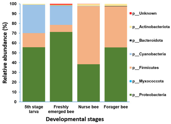 We monitored A. mellifera at four developmental stages—namely fifth stage larva, newly emerged bees, nurse bees, and forager bees from three strong healthy colonies—from a beekeeping facility in the coastal area of Incheon National University apiary, South Korea, in the summer season, June 2023. A section of each hive where the fifth stage larva was present was carefully cut, the larvae were transported to the laboratory in a container with a regulated temperature of 33 °C, and three of the fifth stage larva were each placed in a 15 mL tube (The samples did not come into contact with the nurse bees). Frames with pupae were collected and placed under incubator conditions at 33 °C and 55% humidity. After hatched (24 h later), freshly emerged bees were collected. Nurse bees were collected and engaged in nursing activities near the larva within the selected colony. The forager bees were sampled as they entered the hive through the hive entrance carrying pollen on their legs. All the collected samples were placed into 15 mL plastic containers and properly transported to the laboratory, where they were stored at −80 °C. Three individuals were used per repetition for the four groups, and all experiments were conducted in triplicate. All the samples were collected from three different hives. Sampling for nurse bee and forager bee was performed on one day to avoid delay, and enable proper establishment of the microbiota under the same conditions.