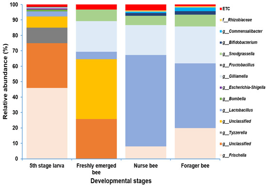 Microbiome composition (genus level) of different samples in varying age groups. Genera with a relative abundance > 1% were scaled up to 100% to visually represent the genus-level diversity of all four groups. The microbiome relative abundances of fifth stage larva, freshly emerged bees, nurse bees, and forager bees are shown.