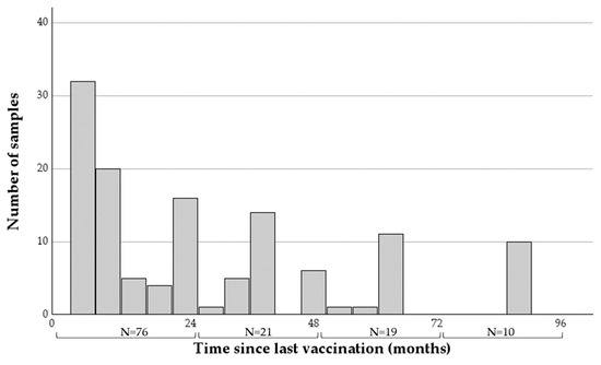 The time intervals from last vaccination to sample collection ranged between six and 91 months (mean = 30.42, SDV = 25.76, Figure 1), with the majority of samples (76 of 126) taken within two years of vaccination.