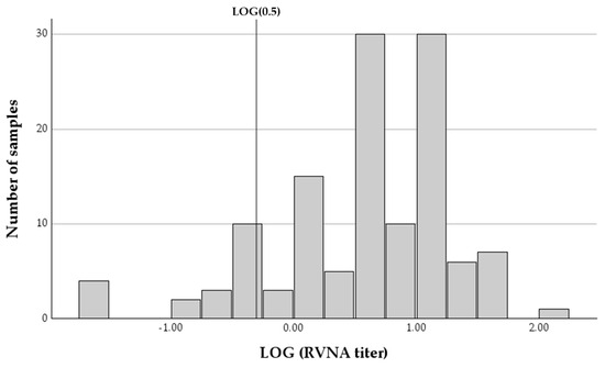 A histogram of the logarithmic distribution of rabies-virus-neutralizing antibody titers (RVNA) in 126 samples collected from horses at different time intervals since last vaccination. The vertical line represents the LOG of the protective threshold of 0.5 IU/mL.