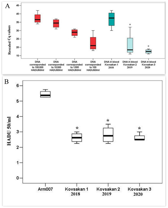 ASFV HADU and DNA levels (rescaled Ct values) in acute and chronic infected pigs’ serum. (A) ASFV DNA levels p72 (Ct values from real-time PCR) in the blood of infected pigs. * Significant compared to Kovsakan1 (p < 0.05) (B) HADU levels in the blood of infected pigs. * Significant compared to Arm 007 (p < 0.05–0.01).