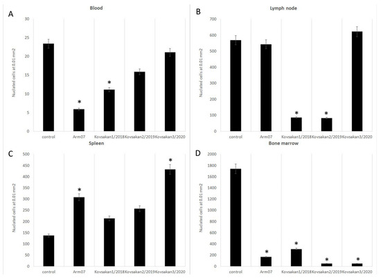 Nucleated cell amount in the blood, lymph nodes, spleen, and bone marrow at late stages of Kovsakan1/2018, Kovsakan2/2019, and Kovsakan3/2020. (A) Nucleated cell amount in the blood. (B) Nucleated cell amount in lymph nodes. (C) Nucleated cell amount in the spleen. (D) Nucleated cell amount in the bone marrow. * Significant compared to control (p < 0.05–0.01).