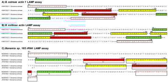 Partial nucleotide sequences of (A) Bonamia ostreae actin-1 gene (GenBank accession number AM410921.1), (B) Bonamia exitiosa actin gene (KM073107.1), and (C) B. ostreae and B. exitiosa 18S rRNA genes (MZ305451.1 and JF831802). The LAMP primer binding sites are highlighted as follows: outer primers F3 and B3 boxed in white; inner primers FIP (F1c + F2) and BIP (B1c + B2) boxed in yellow and green, respectively; loop primers LoopF and LoopB boxed in red.