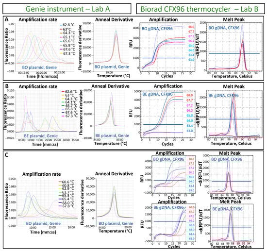 Optimisation of the loop-mediated isothermal amplification (LAMP) reaction temperature for the species-specific detection of (A) Bonamia ostreae (BO), (B) B. exitiosa (BE), and (C) generic assay for the detection of both B. ostreae and B. exitiosa. The amplification and anneal derivative (melt peak) for each LAMP assay are shown when running the assay in either a Genie instrument using plasmid DNA or a CFX96 thermocycler using gDNA.