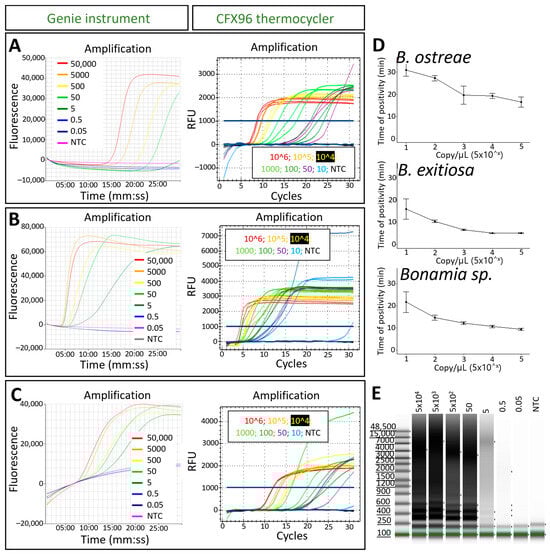 Analytical sensitivity of the species-specific (A) Bonamia ostreae and (B) B. exitiosa and (C) the generic Bonamia LAMP assays. The isothermal amplification of serial dilutions of a recombinant plasmid control is shown either in a Genie instrument (left) or a CFX96 thermocycler (right). (D) Plots showing the linear correlation of copy number/µL and the time of positivity (minute average ± standard deviation). (E) Gel image run in a TapeStation of LAMP products from serial dilutions of a standard control obtained with the generic Bonamia LAMP assay.