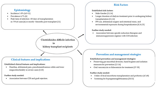 In a United States national hospital discharge survey study involving 162 million adults over a 5-year period, Keddis et al. [5] concluded that the incidence of CDI is doubled in the CKD population in comparison to the general population, and particularly more prominent amongst those who are undergoing dialysis treatment. When we consider the solid organ transplant patient cohorts, there are diverse trends that were presented in terms of the incidence and prevalence of CDI between different organ transplant populations. Kidney transplant recipients appear to have a greater risk of CDI than the general population, though at lower rates than lung and liver transplant recipients [6,7,8]. In a meta-analysis involving 21,683 solid organ transplant recipients, Paudel et al. [6] noted that the prevalence of CDI in kidney transplant recipients was comparatively lower at 4.7% (compared to the overall estimated prevalence in solid organ transplant recipients of 7.4%). This finding was concurred in another study by Hosseini-Mogghadam et al. [8], where the CDI incidence was found to be the lowest in kidney transplant recipients amongst all the solid organ transplant recipients included. Overall, current reports on the cumulative incidence of CDI in kidney transplant recipients range between 1 and 8% [4,9,10,11].