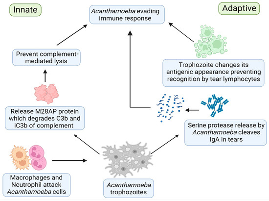 Acanthamoeba has evolved several mechanisms to evade a host’s immune system and cause persistent infections. This characteristic makes AK a challenging disease to manage with conventional techniques. Whilst the surface antigens of Acanthamoeba can elicit a humoral immune response, leading to the production of secretory IgA and serum IgG antibodies, Acanthamoeba trophozoites suppress this immune response by secreting serine proteases, which can cleave IgA and IgG [124,125]. There are lower levels of Acanthamoeba-specific IgA and IgG antibodies in AK patients than in healthy individuals [120,126]. These decreased levels of antibodies enable Acanthamoeba to adhere to the host corneal epithelium and survive in the host for a longer period.