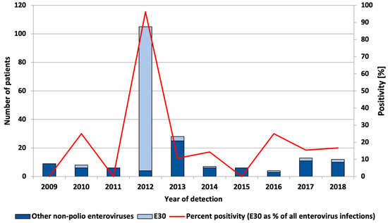 A retrospective study of E30 positivity was conducted for eight years (from 2009 to 2018) before the European upsurge of the virus (in 2018). In 2012, an outbreak of E30 was identified and an active case finding resulted in the identification of a large number of E30 infections. The E30 positivity rate among patients/contacts whose samples were sent to NRL from this outbreak (n = 85) was 100%. Among enterovirus-positive patients without a clear epidemiological link to the outbreak (n = 20), the E30 positivity rate was 80%. The total enterovirus positivity over the period from 2009–2018 was 3.6%, and the E30 positivity rate was 2.1%. The median annual E30 percent positivity among enterovirus infections was 14.8%, with an annual positivity ranging from 0 to 96 and no clear upward or downward trend through the years was observed (Figure 1).