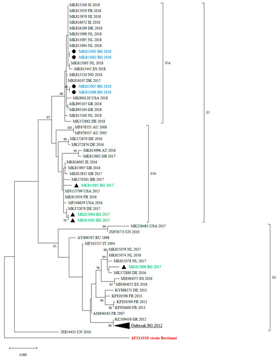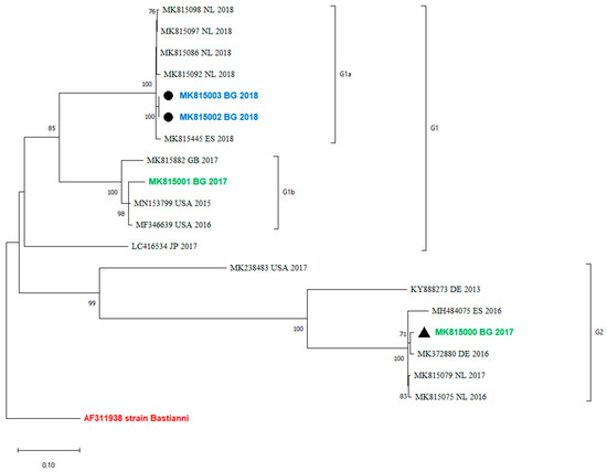 Many molecular epidemiology studies of E30 meningitis outbreaks reveal that outbreaks are associated with the rapid spread of different, closely related, and relatively short-lived variants [1,13,20,21]. Comparing the sequences of previously identified Bulgarian isolates with those identified in 2017 and 2018, we observed a turnover of E30 lineages, shifting from G2 to G1 (Figure 2). A similar genetic turnover was observed in Europe, where the G2 viruses that predominated in 2016 and 2017 in central Europe were subsequently replaced by the G1 and G6 viruses in 2018 [22].