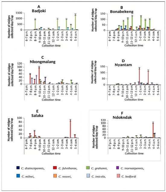 Hourly abundance of Culicoides midges collected using the UV-light trap technique in (A) Badjoki, (B) Bonbekeng, (C) Nkongmalag, (D) Nyantam, (E) Salaka and (F) Ndokndak. Bars show standard error of the mean.