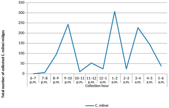 In the hourly collection of the light trap visiting cycle, the highest collection peak was observed with C. grahamii at 5–6 a.m., while C. milnei was characterized by three peaks, with the highest in the early morning at 1–2 a.m., followed by 9–10 p.m. and lastly at 3–4 a.m. In contrast, C. grahamii had the highest collection peak at 3–4 a.m., while C. milnei was characterized by two active peaks at 10–11 p.m. and 2–4 a.m. in the south-west region [3]. This paradigm may be the result of the influence of abiotic factors like temperature and annual precipitation rate in both regions.