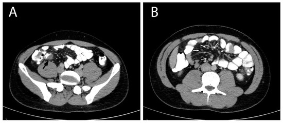 Abdomen contrast-enhanced MRI of a patient with invasive intestinal anisakiosis. (A): Distal ileum lesion (black arrow). (B): Multiple lymph nodes along ileocolic vessels (white arrows).