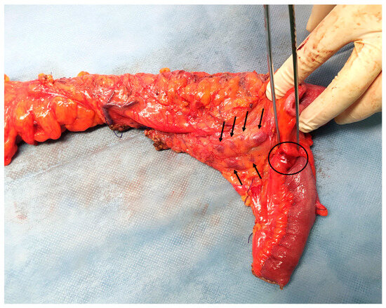 Colectomy of a patient with invasive intestinal anisakiosis. Multiple enlarged lymph nodes (arrows) and a lesion in the distal ileum (circle, also shown in Figure 1A) are visible.