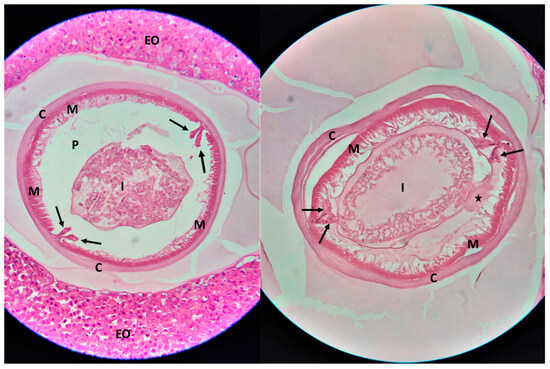 Two histological sections (hematoxylin and eosin; original magnification ×400) of Anisakis spp. in surgically excised granulomatous lesions of the intestine and the mesentery. The cross-section of the nematode’s body shows a smooth cuticle (C), a pseudocelomatic cavity (P), polymyarian/coelomyarian type muscle layer (M), the intestinal tract (I), prominent Y-shaped (clover-shaped) lateral chords (arrows), and the excretory organ (asterisk). The parasite is surrounded by granulomatous tissue with inflammatory cells, mainly eosinophils (EO).