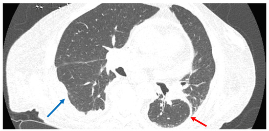 CT scan of the chest on admission showing small right pleural effusion (blue arrow) and a loculated left pleural effusion with associated pleural and left hemidiaphragm thickening (red arrow). There was also an infiltrate in the lingula.