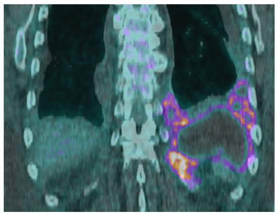 PET scan performed 4 days after the initial admission showing a large, tracer avid loculated pleural effusion in the left lung base measuring 14.5 cm × 2.8 cm × 11.0 cm, most consistent with chronic inflammation or infection. There was no primary lung mass or frank bony destruction, though there was some localized bone remodeling/periostitis.