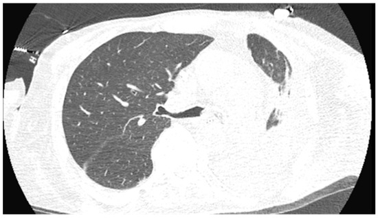 After discharge, NGS performed on the empyema sample yielded a positive result for Pseudopropionibacterium propionicum (P.p.). The empyema fluid submitted for an AFB, fungal, and routine culture remained negative after 4 weeks of incubation. Two weeks after discharge, the patient was admitted to an outside hospital due to seizures on imipenem. Once stabilized, he was transferred back to our hospital; he had been off his antibiotics for one week as the other providers discontinued them due to not finding any active infection. A repeat CT showed worsening of his pulmonary situation, with an obstruction of the left mainstem bronchus and near complete collapse of the left lower lobe, bilateral pleural effusions, and peripheral atelectasis of the left upper lobe and lingula (Figure 5). The patient was started on ceftriaxone at 2 g and minocycline was continued. A bronchoscopy showed mucus plugging and a bronchoalveolar lavage did not identify P.p. on NGS, indicating the efficacy of the antimicrobials that had been received to date. Still, we elected to treat this infection like actinomycosis, with intravenous ceftriaxone for six weeks, followed by a planned six to eleven months of oral minocycline. He had completed nine months of treatment with an apparent resolution of the initial P.p. infection but died from sepsis from an intestinal perforation due to a strangulated hernia. The sequence of clinical events for this patient is summarized in Table 1.