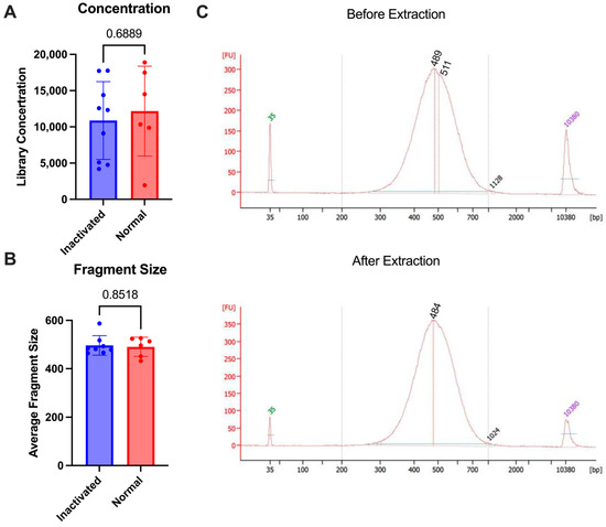 Comparison of 10X libraries with inactivation (blue) or without (normal, red). (A) Concentrations of libraries. (B) Average size of fragments. (C) Bioanalyzer trace comparison of a single sample before re-extraction (1:5 dilution) as compared with after (undiluted) using RLT buffer. p-values are determined by a Mann–Whitney test.