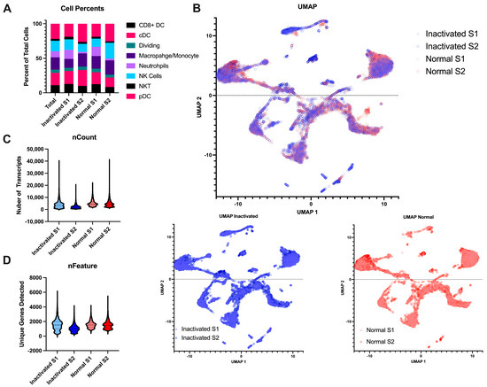 Single-cell libraries from the mouse lymph nodes were sequenced following the recommendations from 10X genomics for cycles on the Illumina NextSeq (Illumina, San Diego, CA, USA). After sequencing, samples were processed through the cellRanger pipeline (v6.0.1) from 10X Genomics for deconvolution and alignment to the mouse genome. Following alignment, matrix files were read into R (v4.2.1) using Seurat version 4 [10]. Cell IDs were determined using the method described in [11,12,13] using the Immgen Database [14] as a back end. Analysis was performed in Seurat to integrate the samples, create UMAP and PCA projections, and look at differences between conditions. To remove the effects of different abilities for the Milently beads to remove T and B cells on a per-sample basis, lymphocytes were excluded from the analysis. Additionally, samples were filtered for dead/dying cells as well as doublet populations. Gene markers for each cell type can be seen in Figure 1 in addition to a UMAP with the annotated cell types.