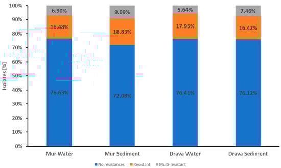 Many studies show that antibiotic resistance can be found in nearly every type of environment [27]. Rivers and lakes seem to play a key role, as the wastewater from cities and hospitals eventually flows into public waters. Previous research has suggested that river sediments contribute to the prolonged persistence of various bacteria and resistance mechanisms, more so than in open river waters [17,28]. In the current study, we demonstrate that three-quarters of the tested E. coli Mur River (water and sediment) isolates were susceptible to all tested antibiotics. When compared to studies conducted in other locations, the proportion of resistant and multi-resistant E. coli isolates in the Drava River and the Mur River is low [5,6,29,30,31,32,33]. This could be related to the fact that the Mur and Drava flow through only a few major cities, and that waste-water treatment processes in Austria maintain a very high standard of quality.