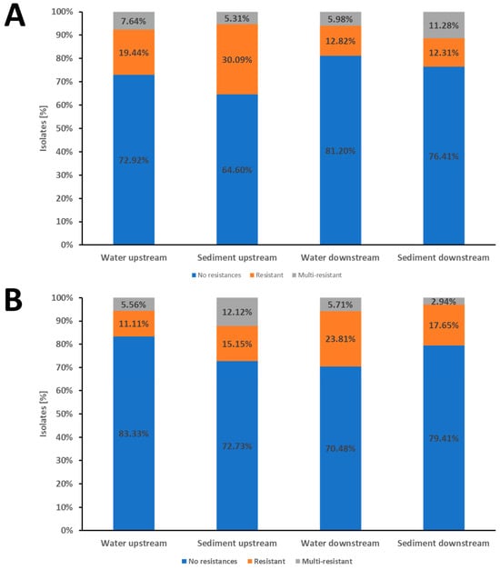Proportions of resistance and multi-resistance in E. coli isolates. Panel (A): Isolates from the Mur River. Panel (B): Isolates from the Drava River. Panel (A,B): The stacked columns represent the proportions of isolates showing the respective phenotype in the water and sediment samples from upstream and downstream of Graz (A) or Villach (B) and its WWTP. Blue columns indicate isolates susceptible to all antibiotics tested. Isolates with resistance to one or two classes of the tested antibiotics were classified as resistant (indicated in the orange part of the columns). Resistance to three or more classes of the tested antibiotics was classified as multi-resistant (indicated in the gray part of columns).