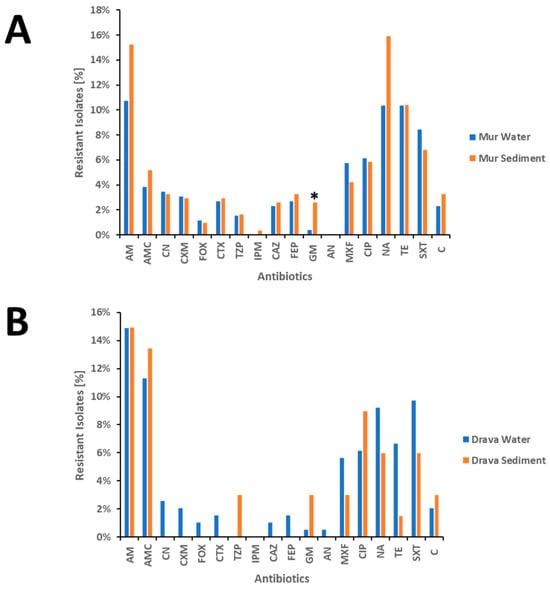Proportions of E. coli isolates resistant to the tested antibiotics. Panel (A): Isolates from the Mur River. Panel (B): Isolates from the Drava River. Panel (A,B): Blue columns indicate isolates from the water samples, and orange columns indicate isolates from the sediment samples. * indicates a significant difference with a p-value less than 0.05. AM, ampicillin; AMC, amoxicillin–clavulanic acid; TZP, piperacillin/tazobactam; CN, cephalexin; CXM, cefuroxime; FOX, cefoxitin; CTX, cefotaxime; CAZ, ceftazidime; FEP, cefepime; AN: acrylonitrile; IPM, imipenem; CIP, ciprofloxacin; MXF, moxifloxacin; GM, gentamicin; SXT, trimethoprim/sulfamethoxazole; TE, tetracycline; NA, nalidixic acid; C, chloramphenicol.