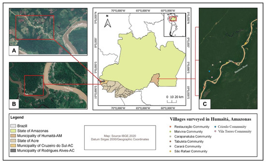 Map of the study areas with the following descriptions: (A) Nova Cintra Community in the municipality of Cruzeiro do Sul, Acre, Brazil; (B) Boca do Moa Community in the municipality of Rodrigues Alves, Acre, Brazil; (C) Humaitá Communities, Amazonas, Brazil.