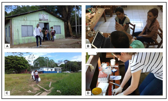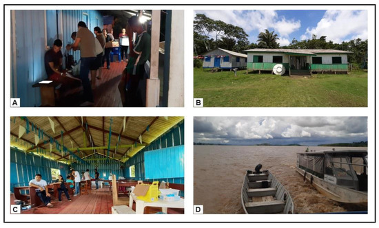Collection in riverside communities of Humaitá, Amazonas, Brazil. (A) House in the Tabuleta community; (B) school in the Carará community; (C) church in the Creole community; (D) boats used to visit other communities.