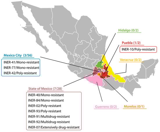 Mycobacterium tuberculosis strains were isolated from HIV-infected patients from seven different states of Mexico (Figure 1) without any other comorbidities and treated in the National Institute of Respiratory Diseases “Ismael Cosio Villegas” (Mexico City) between January 2014 and December 2019. Mycobacteria were isolated from both pulmonary and extrapulmonary samples. Demographic and clinical data were recovered from the clinical files of each patient and included the state of residence, age, sex, occupation, level of education, clinical sample, type of TB (pulmonary or extrapulmonary), and CD4 T-lymphocyte count.
