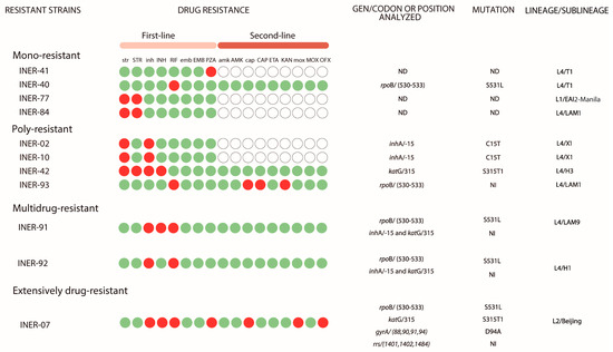 Resistance patterns, associated mutations, and lineage and sublineage to which the strain belongs. str: Streptomycin (1.0 μg/mL); STR: Streptomycin (4.0 μg/mL); inh: Isoniazid (0.1 μg/mL); INH: Isoniazid (0.4 μg/mL); RIF: Rifampicin (1.0 μg/mL); emb: Ethambutol (5.0 μg/mL); EMB: Ethambutol (8.0 μg/mL); PZA: Pyrazinamide (100 μg/mL), amk: Amikacin (1.0 μg/mL); AMK: Amikacin (2.0 μg/mL); cap: Capreomycin (2.5 μg/mL); CAP: Capreomycin (5.0 μg/mL); ETA: Ethionamide (5.0 μg/mL); KAN: Kanamycin (2.5 μg/mL); mox: Moxifloxacin (1.0 μg/mL); MOX: Moxifloxacin (2.0 μg/mL); OFX: Ofloxacin (2.0 μg/mL). Green circle: SENSITIVE; red circle: RESISTANT; blank circle: was not performed. ND: not determined. NI: not identified. L1: Lineage 1 (Indo-Oceanic); L2: Lineage 2 (East-Asian); L4: Lineage 4 (Euro-American).