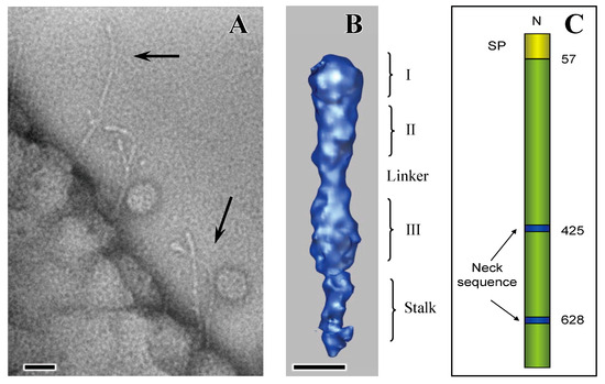 EmaA structure: (A) transmission electron micrograph of EmaA appendages acquired from a whole-mount preparation of a nonfimbriated bacterium showing the typical bends of the adhesin. Bar, 20 nm. Black arrows point to the most characteristic bend. (B) Surface representation of the 3D structure of the functional domain of EmaA obtained using electron tomography and subvolume averaging. (C) Cartoon with the corresponding amino acids. Only the head (57–627) and portion of the stalk domains are presented in (B) and (C). I, II and III represent subdomains SI-SIII; N: NH2-terminus of the polypeptide; SP: signal peptide; 57 is the start of the polypeptide after cleavage of the signal peptide; 425 and 628 represent the start amino acids of the neck sequences. Bar, 5 nm. Adapted from [35].
