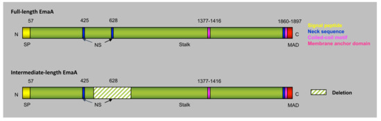 Molecular forms of EmaA proteins. Two forms of EmaA are shown: full-length and intermediate, which lacks 279 amino acids after the first neck sequence at amino acid 425. The full-length EmaA was found mainly in serotypes b and c while the intermediate EmaA was only present in serotypes d and a. Numbers correspond to amino acid number of the predicted protein. N: NH2-terminus of the polypeptide; SP: signal peptide; MAD: membrane anchor domain; C: COOH-terminusof the polypeptide. The whole polypeptide is represented as green with specific motifs colored as indicated in the legend.