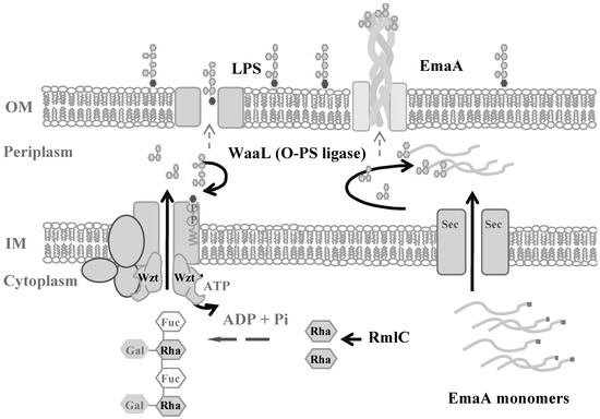 LPS is synthesized utilizing a well-defined sequence of enzymatic reactions, which include enzymes associated with sugar synthesis, an ABC sugar transport protein (wzt), and an O-antigen ligase (waaL) [63] (Figure 6). The enzymes in this pathway have been identified in A. actinomycetemcomitans [64,65,66]. Interestingly, genetic and pharmacological studies disrupting O-PS synthesis in both the serotype a and b strains revealed changes in the mass of the protein monomers (as visualized by a change in the electrophoretic mobility of the monomers) and a reduction in the amount of EmaA associated with the membrane [64]. In addition, a lectin specific to one of the serotype b O-PS sugars was demonstrated to bind to the protein [64]. These experiments suggest that: (1) EmaA is a glycoprotein modified with the sugars associated with the O-antigen and (2) EmaA utilizes the same enzymatic mechanism for post translational modification as the O-antigen does for conjugation to the LPS core oligosaccharide.