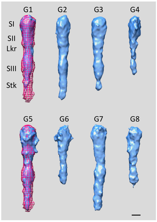 Surface representations of the EmaA averages of subgroups G1–G8 from rmlC mutant strains [70,74]. Mesh: wild-type EmaA structure; EmaA subdomains: SI–SIII; Lkr: linker region; Stk: stalk region. Bar, 3 nm.
