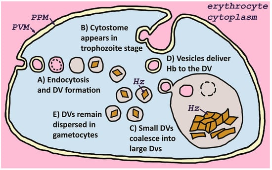 The endocytic uptake of host erythrocyte cytoplasm was described in the early days of electron microscopy of the malaria parasite, and it was correctly surmised that this endocytosis was related to the digestion of hemoglobin []. Endocytosis producing small vesicles commences during the ring stage shortly after the parasite invades the host erythrocyte []. The intraerythrocytic parasite is surrounded by a membrane partially of host origin [,], called the parasitophorous vacuolar membrane (PVM). Therefore, endocytosis results in double-membrane vesicles with the inner membrane originating from the PVM []. The inner membrane rapidly disappears and initially the vesicles function as individual digestive vacuoles []. As the parasite grows and develops, the small independent digestive vacuoles coalesce into larger digestive vacuoles (Figure 1). The timing of this coalescence varies according to species with some species forming a large digestive vacuole during the early trophozoite stage, whereas in other species the large digestive vacuole appears in the late trophozoite stage []. In addition, it has long been recognized that the small digestive vacuoles do not coalesce into larger digestive vacuoles in the gametocytes, but remain dispersed as small vesicles [].