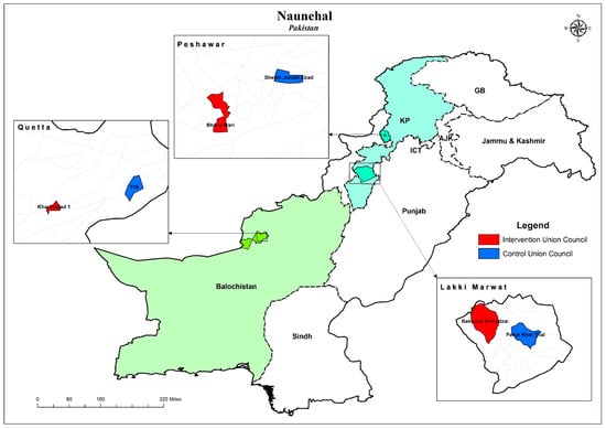 The three UCs were the intervention sites, and for each of these target UCs, a separate, matched-control UC of a comparable size, population, and location, and coverage indicators were identified, with propensity score matching and in consultation with local partners. The control UCs were Ward-11-A (Quetta District), Pahar Khel Thal (Lakki Marwat District), and Sheikh Junaidabad (Peshawar District), which, though always in the same district, never bordered the target UC.