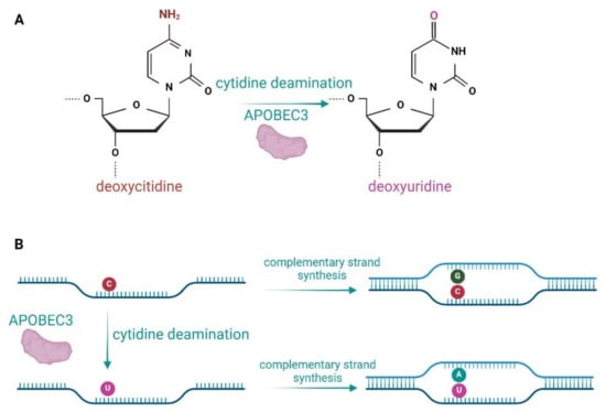 Most early research on the antiviral activity of APOBEC3 has focused on retroviruses and retroelements, with deamination of retroviral RNA being the primary mechanism of viral inhibition []. However, APOBEC3 proteins are also strongly involved in the inhibition of DNA viruses. The genome of DNA viruses becomes a compelling substrate for APOBEC3 deamination mostly during replication and transcription, resulting in single-stranded DNA. However, APOBEC3 editing is not restricted to the DNA genome. This intrinsic mechanism of host defence may also be responsible for a long-term host’s DNA hypermutation and cancer development during persistent viral infections.