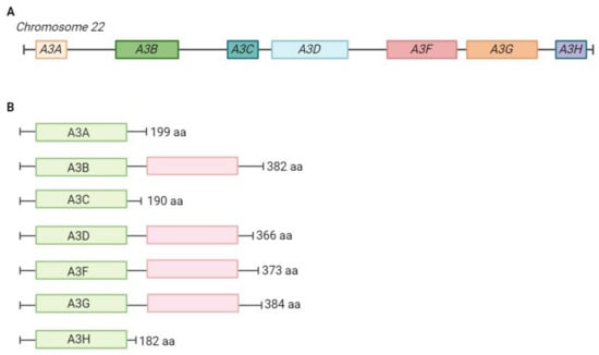 Genomic organisation of the APOBEC3 locus and domain organisation of APOBEC3 proteins. (A) APOBEC3 locus on chromosome 22. APOBEC3 genes evolved through complex gene duplication and positive selection [,]. (B) Domain organisation of the seven human APOBEC3 proteins. APOBEC3 proteins have either one or two zinc-binding domains. In four APOBEC3s (A3F, A3B, A3D, A3F, A3G) the first domain (in green) is catalytically active, the second domain (in red) is catalytically inactive. The length of the protein is shown in the number of amino acids. aa—amino acids.