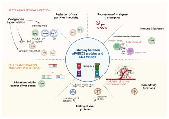 Infection with oncogenic viruses causes about 15–20% of all cancers in humans, and DNA tumour viruses account for a large proportion of these []. The human papillomavirus (HPV), the hepatitis B virus (HBV) and the Epstein–Barr virus (EBV) alone are responsible for 85% of all cancers caused by viral infections []. Some of these viruses encode oncogenes that target host tumour suppressor genes []; however, at least part of cancer development depends on somatic mutagenesis that targets specific host genes involved in cell proliferation and survival. APOBEC3 proteins are crucial players in the interaction of DNA viruses with their human hosts and may represent a viable target for diagnostic or therapeutic intervention. In this review, we aim to highlight the fine line between the antiviral activity of APOBEC3 proteins and deleterious host DNA editing when this process is deregulated.