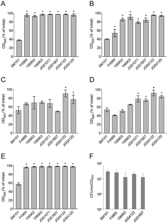 As expected, spores of FP strain SM101 and NFB strain F4969 germinated well with AK, L-cysteine, and L-lysine, but not with Tris-HCl. An ~ 50–60% decrease in OD600 was observed after incubation of SM101 or F4969 spores with 100 mM AK (pH 7.0), 100 mM L-cysteine (pH 7.0), or 100 mM L-lysine (pH 7.0) at 37 °C for 90 min (p < 0.05) (Figure 1B–D). As consistent with our previous finding [33], while SM101 spores germinated significantly with BHI or KCl, F4969 spores germinated very poorly; only a ~ 10–15% OD600 decrease was observed when F4969 spores were incubated with 100 mM KCl (pH 7.0) or BHI (pH 7.0) at 37 °C for 90 min (Figure 1A,E).