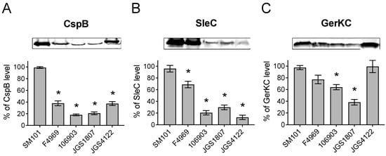 The lower transcripts of cle genes in animal strains suggest the lower production of CLE proteins by these strains. To confirm this, we performed quantitative Western blot analyses to assess the levels of CspB and SleC production in animal strains. We also assessed the production of GerKC, a major GR protein in animal strains. Our results found that the levels of CspB and SleC proteins were significantly lower in spores of animal strains as well as NFB F4969 compared to that in FP SM101 (Figure 4A,B). This finding is in agreement with the low transcript levels of cspB and sleC in animal strains and NFB F4969 compared to that in FP SM101(Figure 3F,H). Interestingly, an almost similar level of GerKC production was found in poultry strain JGS4122 and FP SM101 as well as NFB F4969 (Figure 4C), although gerKC transcript level was significantly higher in JGS4122 than in FP SM101 (Figure 3C). Furthermore, a significantly lower GerKC level was found in strains 106903 and JGS1807 compared to that in FP SM101, although the gerKC transcript level was higher in these strains than FP SM101. Collectively, our results suggest that animal strains possess low copies of CLE proteins involved in spore’s cortex hydrolysis compared to the FP strain SM101.
