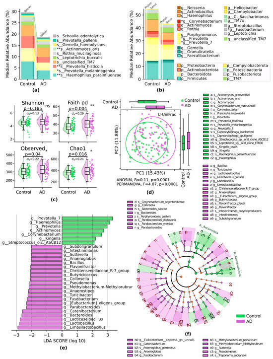 Figure 2. Oral microbiome compositional dissimilarities in AD and control groups: (a) median relative abundance of most abundant species; (b) median relative abundance of the top genera of most abundant phyla; Mann–Whitney U test; (c) α-diversity. Shannon and Chao1 indices. Number of observed OTUs and Faith phylogenetic diversity (pd). Mann–Whitney U test, with abs. Cliff’s delta effect size (normalized U statistic) a; (d) β-diversity. Principal coordinate analysis (PCoA) ordination based on the unweighted UniFrac (U-UniFrac) distance. ANOSIM R, PERMANOVA F with permutations; (e) LefSe bar plot, LDA < 2 at the genus level; (f) LefSe cladogram at the genus and species levels. * p ≤ 0.05, ** p ≤ 0.01. a Cliff’s delta quantifies how often values in one distribution are higher than in the second distribution.