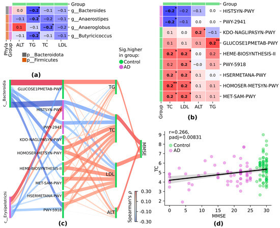 Figure 4. Significant correlations between differentially abundant features in AD and control groups: (a) between taxa and clinical parameters; (b) between pathways and clinical parameters; (c) between taxa, pathways, clinical parameters, and MMSE. Sankey plot of significant correlations. (d) Scatter plot comparing TC levels and MMSE scores. Spearman’s ρ, p ≤ 0.05; TC = total cholesterol; LDL = low-density lipoprotein; ALT = alanine transaminase; TG = triglycerides; MMSE = Minimized Mental State Examination. For differentially abundant features, a group with a higher relative abundance is highlighted: in green, the relative abundance is higher in the control group, and in purple, it is higher in the AD group. * p ≤ 0.05, ** p ≤ 0.01.