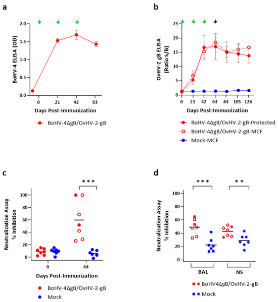 Antibody production in rabbits immunized with BoHV-4∆gB/OvHV-2-gB or with a mock inoculum and challenged with OvHV-2. (a) BoHV-4 antibody response in plasma, as measured by a BoHV-4 commercial ELISA. (b) OvHV-2-gB antibody response in plasma as quantified by an OvHV-2 gB-specific ELISA. In panels (a,b), green arrows indicate immunizations times and the black arrow challenge; error bars represent SEM. gB-dependent neutralization of an AlHV-1∆gB/OvHV-2-gB chimeric virus by antibodies in plasma, bronchoalveolar lavage (BAL), and nasal secretions (NS), as measured by in vitro virus neutralization assay, are shown in panels (c,d), with bars indicating the means. (c) Percentage of inhibition using plasma samples obtained prior to immunization, 0 DPI, and on the day of OvHV-2 challenge, 64 DPI. (d) Percentage of inhibition using bronchoalveolar lavage (BAL) and nasal secretions’ (NS) terminal samples. In (b–d), BoHV-4∆gB/OvHV-2-gB-immunized animals that developed MCF following OvHV-2 challenge are represented by open symbols. **, p < 0.01, and ***, p < 0.001.