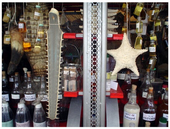 - Ferreira, F.S.; Brito, S.V.; Ribeiro, S.C.; Saraiva, A.A.F.; Almeida, W.O.; Alves, R.R.N. Animal-based folk remedies sold in public markets in Crato and Juazeiro do Norte, Ceará, Brazil. BMC Complement. Altern. Med. 2009, 9, 17. [Google Scholar] [CrossRef]