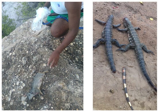 - Alves, R.R.N.; Pereira Filho, G.A.; Silva Vieira, K.; Silva Souto, W.M.; Mendonça, L.E.T.; Montenegro, P.; Almeida, W.d.O.; Silva Vieira, W.L. A zoological catalogue of hunted reptiles in the semiarid region of Brazil. J. Ethnobiol. Ethnomed. 2012, 8, 27. [Google Scholar] [CrossRef]