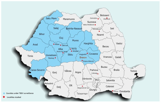 Although in Romania I. ricinus ticks have a large distribution, they have been found on a variety of domestic animals, and infected animals with TBEV have been found, the risk of TBE is reported mainly in Transylvania; however, data are scarce [7,8].