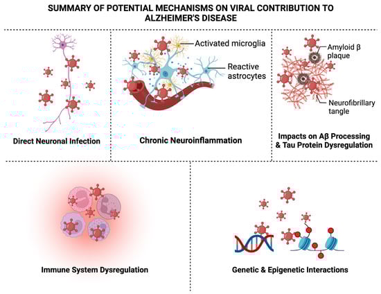 As discussed briefly throughout this review, there are several recognized potential mechanisms proposed for the virus–AD hypothesis which encompass direct neuronal infection, chronic neuroinflammation, altered Aβ processing, tau protein dysregulation, immune system dysregulation, blood–brain barrier disruption, and genetic and epigenetic interactions that may contribute to the development or exacerbation of AD, as shown in Figure 2, which we will briefly elaborate on next.