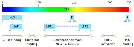 Functional domains of Tax. NLS: nuclear localization signal; E: nuclear export signal, P: PDZ-binding motif; ZnF: zinc finger; LZR1 and LZR2: leucine zipper regions 1 and 2.
